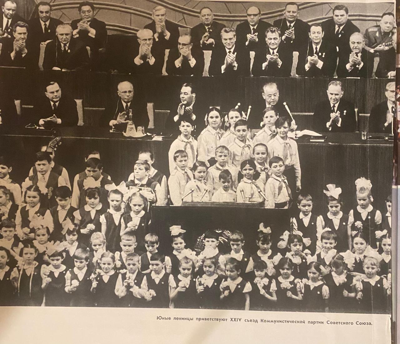 На фото - участники 24 съезда КПСС (1971), на трибуне среди молодежи - юный диктор Галина Власова.