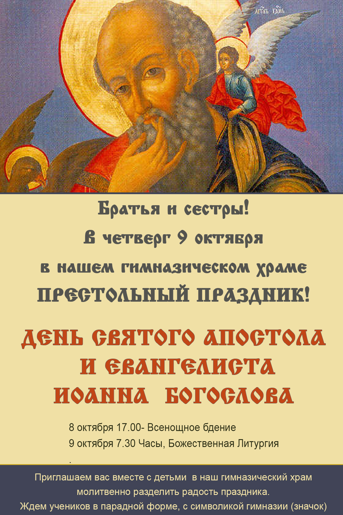 Дорогие братья и сестры — учащиеся, учащие, родители, выпускники, прихожане, друзья!9 октября в день преставления апостола и евангелиста Иоанна Богослова приглашаем вас в домовый храм гимназии на престольный праздник молитвенно почтить его память.